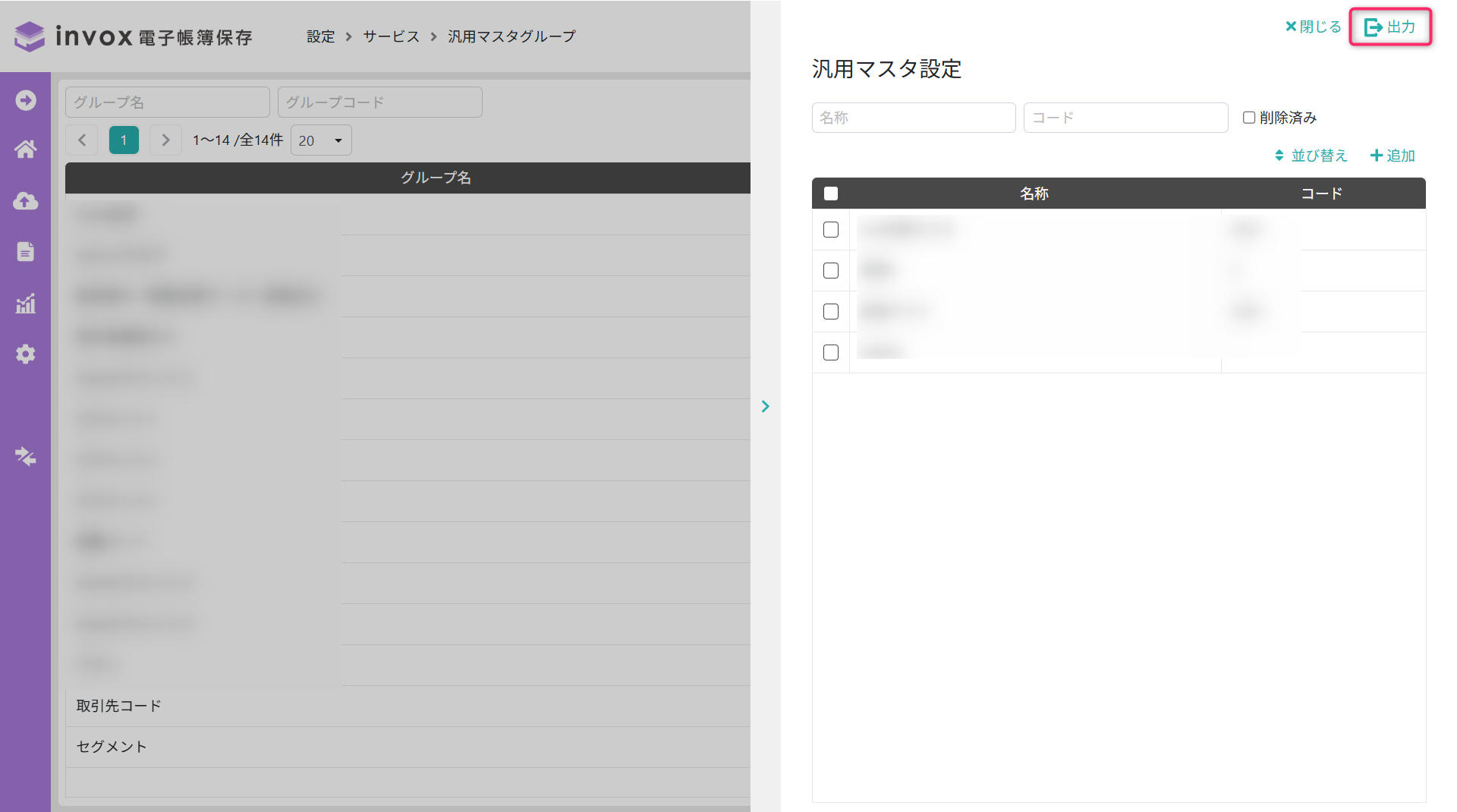 サイドメニューの[設定]-[サービス]-[汎用マスタグループ]から設定画面を開きます。