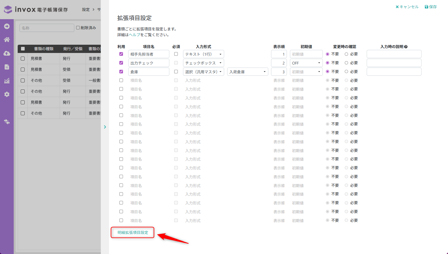 明細拡張項目設定では書類毎に追加する明細拡張項目を30項目まで管理できます。