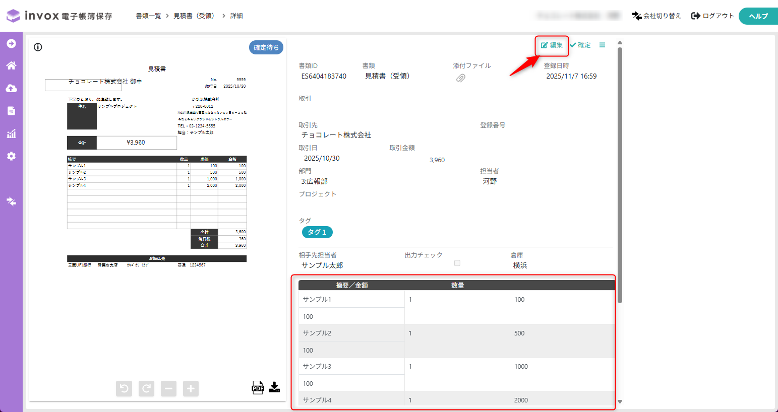保存書類設定の一覧が開きますので、一番右の列にある「編集」から開きます。