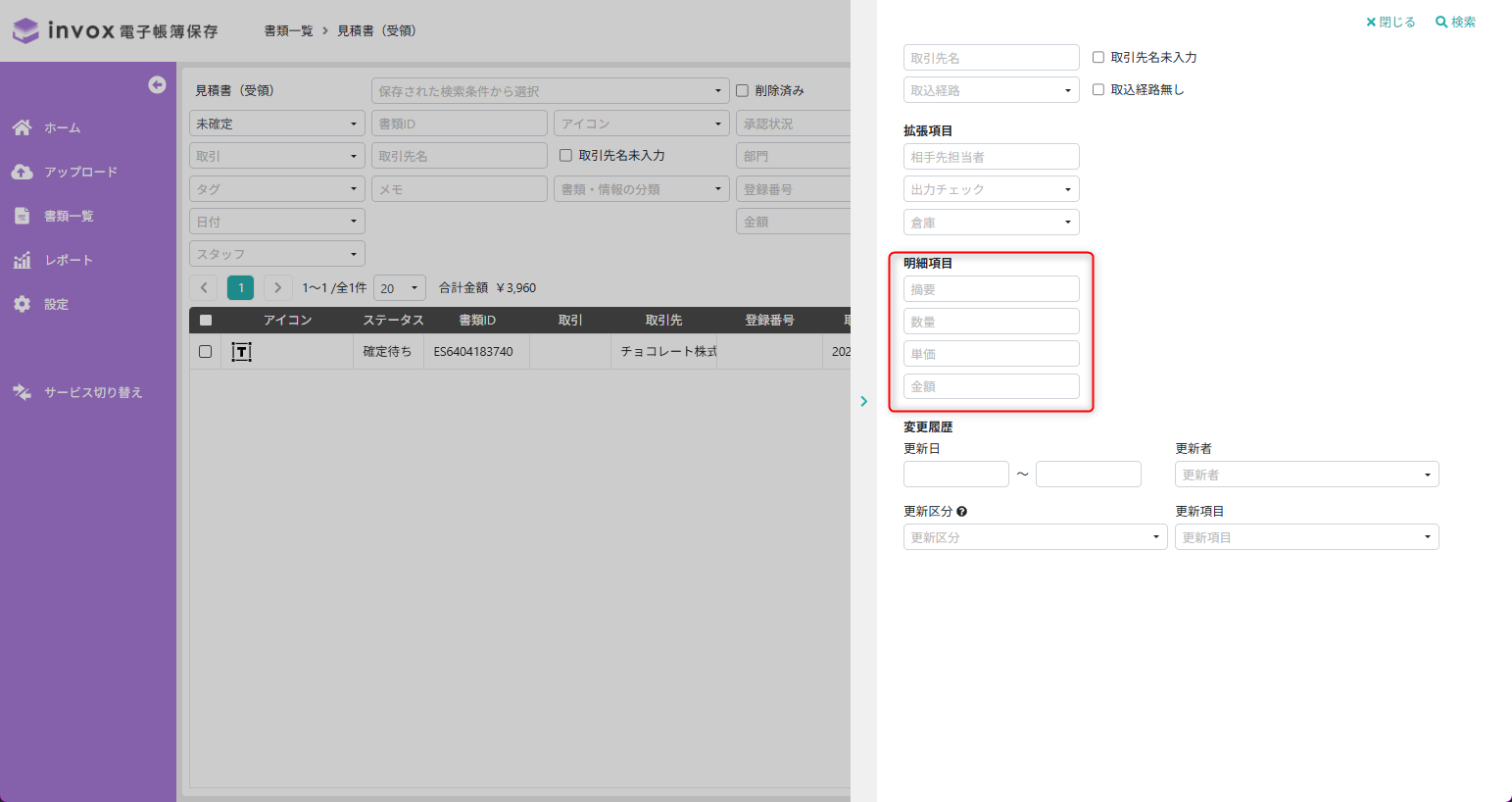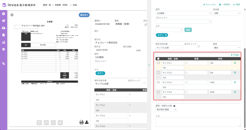 明細拡張項目設定をご利用いただくと、書類ごとに任意の明細管理項目を設定してお使いいただけます。