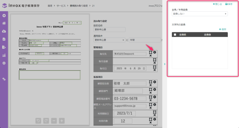 項目ごとに設定ボタンから「全角/半角変換」や指定した文字列の変換の設定が行えます。