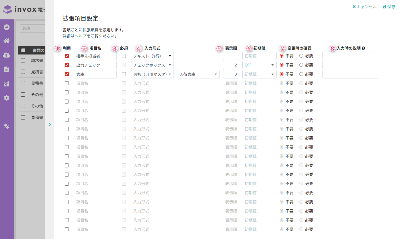 拡張項目設定では書類毎に追加する拡張項目を20項目まで管理できます。