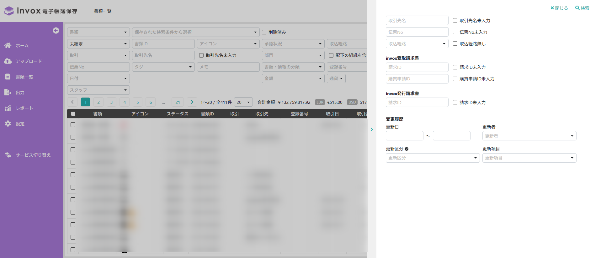 invox電子帳簿保存にアップロードされた書類データの一覧表示は、以下のステップで行います。