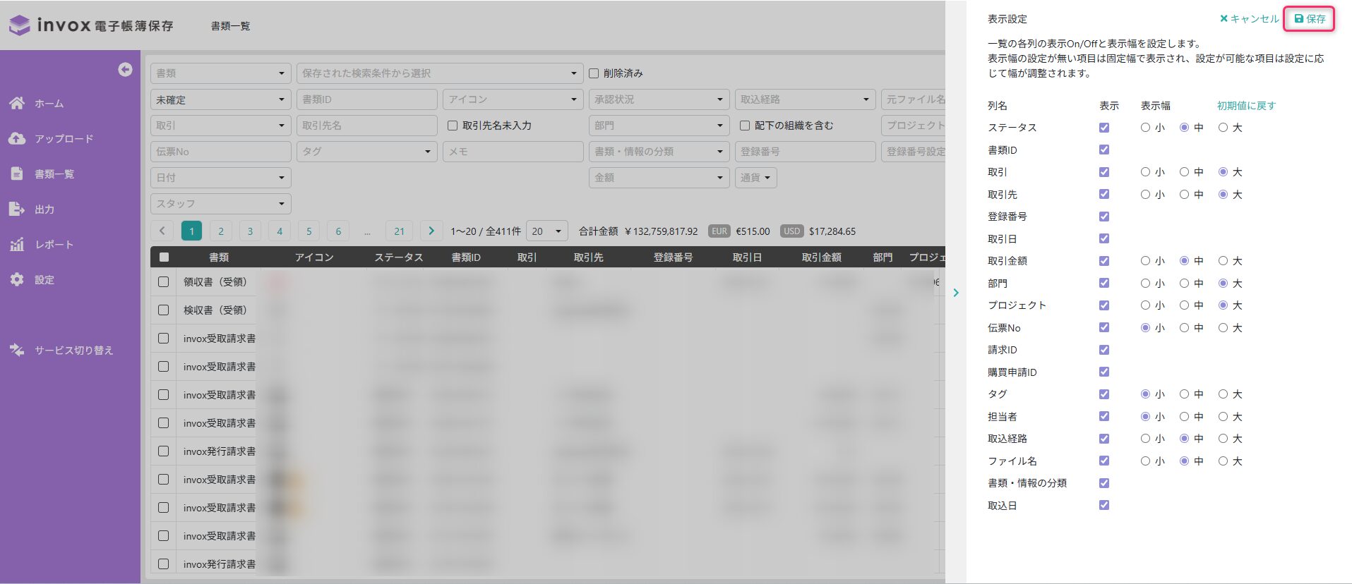 一覧表示欄の不要な列を非表示にしたり、表示される列の幅を大・中・小から設定できます。