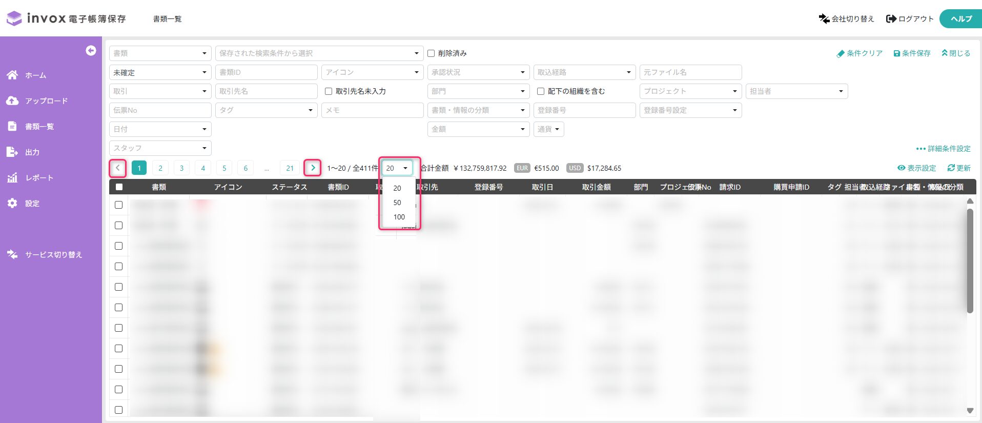 一度に表示される書類の数は20件/50件/100件から選択できます。