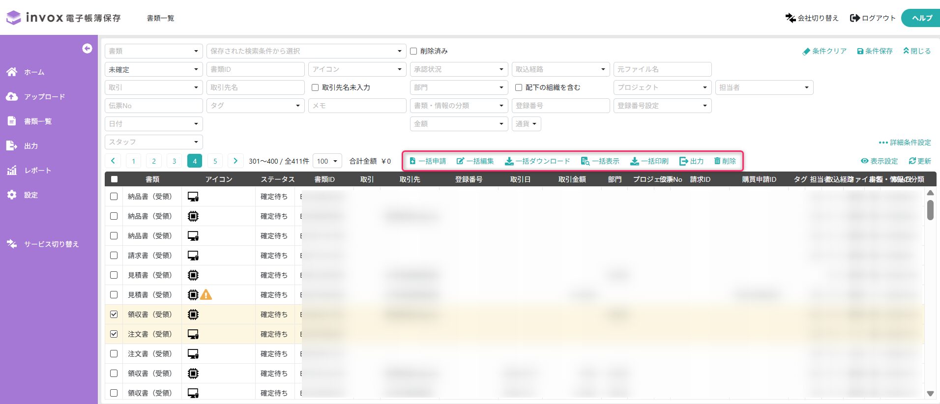 行の先頭のチェックボックスをONにすると、操作ボタンが一覧の上に表示され、複数の書類を一括操作できます。
