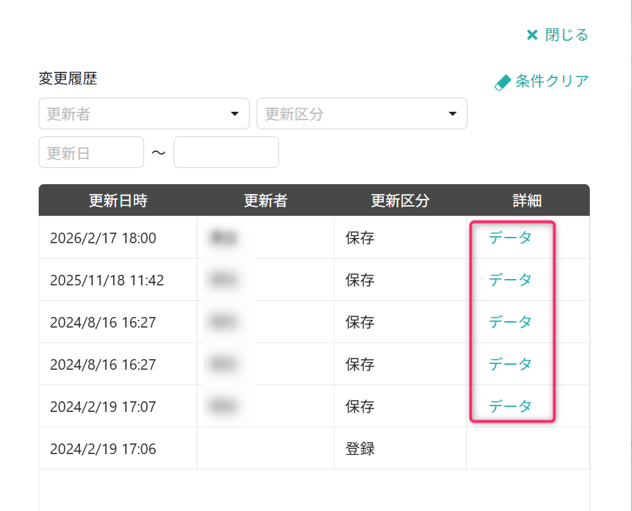 ・API連携やインポートでの変更は変更履歴が記録されません。
